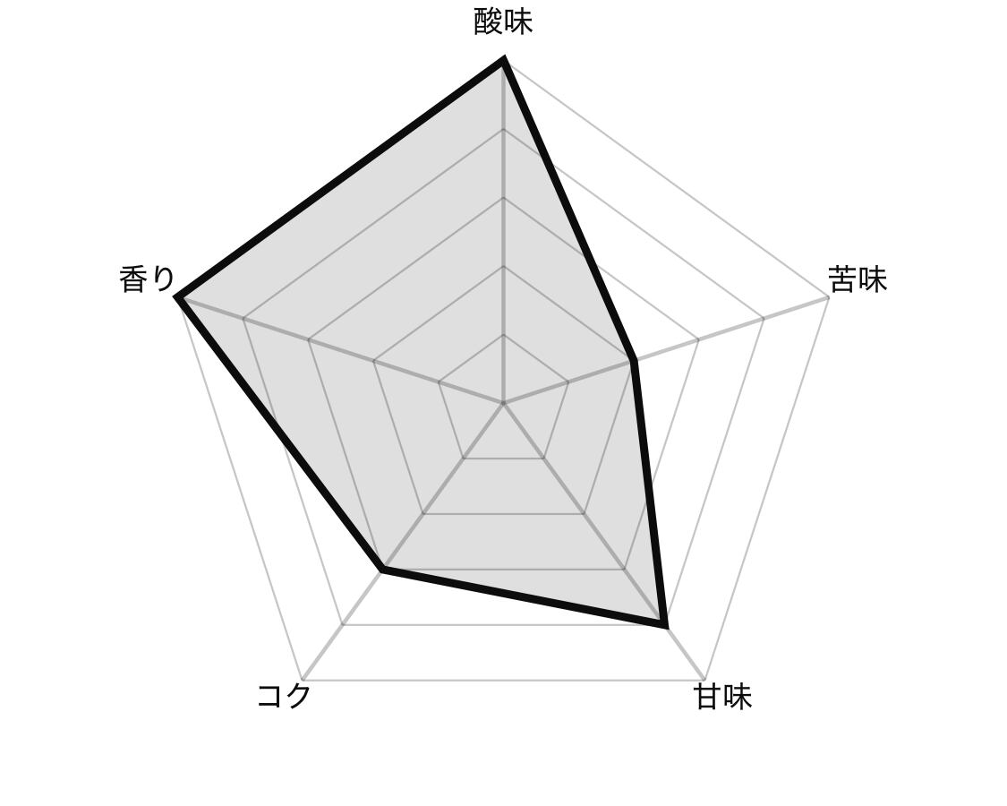 まるで白桃を思わせるような甘く華やかな香りが特徴です。一口飲むと、華やかな酸味が広がり、その後から熟した果実のような甘さが追いかけてきます。